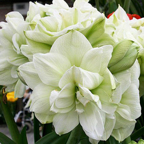 Амариллис махровый Мэрилин - это великолепное растение с изысканными белыми цветками, которые радуют глаз своей красотой в июле, августе и сентябре. Высота этого амариллиса может достигать 50-70 см, что делает его прекрасным украшением для газонов, групповых посадок или одиночных насаждений. Листья зеленого цвета создают яркий контраст с нежными цветками, придавая растению особый шарм.