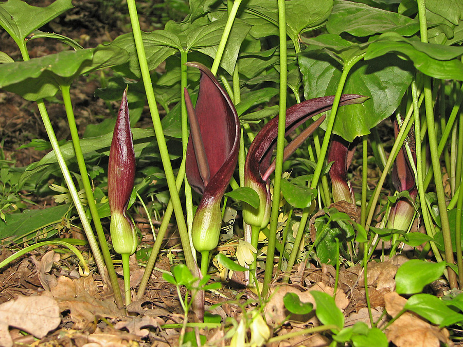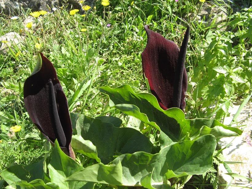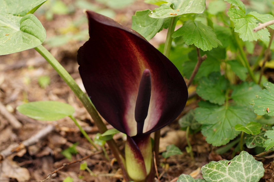- Стебли мясистые с пятнами коричневого цвета. Из-за этих коричневых пятен создается эффект змеиной кожи. Соцветие на стебле появляется в начале лета и представляет собой початок с покрывалом. Покрывало - волнистое по краям и его длина 45 см. Оно бледно-зеленое снаружи, а внутри – пурпурно-багровое. Початок тоже 45 см, а цвет темно-красный.