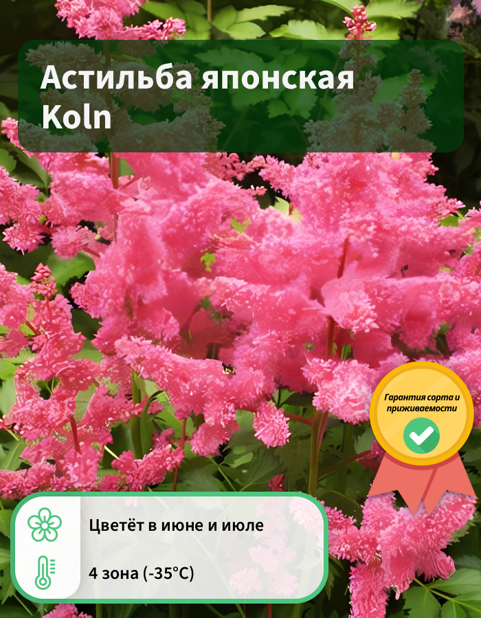 Рассада астильбы японской Koln позволяет украсить сад компактными кустами высотой до 50 сантиметров. Летом на фоне зеленой листвы распускаются пышные метельчатые розовые соцветия. Их можно срезать и использовать для составления нежных букетов. Этот сорт прекрасно подходит для создания миксбордеров, рабаток и клумб. Рассада астильбы японской Koln хорошо растет на влажной плодородной почве в тенистых местах. При достаточном количестве воды растение способно легко пережить даже самую жаркую погоду. Этот сорт обладает высокой зимостойкостью и не нуждается в укрытии.
