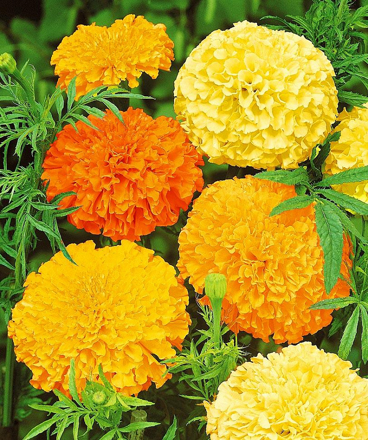 Бархатцы прямостоячие махровые смесь окрасок - это великолепное растение, которое поразит вас своей красотой и изяществом. Стебли этого растения прямые и прочные, достигают высоты до 90 см, а диаметр цветка может достигать 10 см. Цветки бархатцев окрашены в жёлто-оранжевую гамму, что придает им особый шарм и привлекательность.