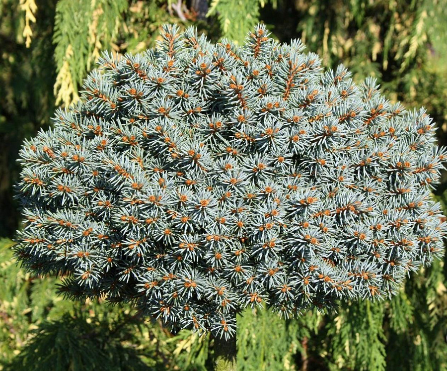 Саженцы ели колючей Мекки (Picea pungens Mecki) зачастую используют для создания композиций в стиле «бонсай», благодаря оригинальной карликовой форме. Ассиметричная крона состоит из нескольких стволов и густых ветвей разной длины. В возрасте 10 лет вырастает до 1 метра в высоту и охвата кроны до 1,5 метров. Максимально возможная высота растения – 2 метра. Крона подлежит искусственному формированию при помощи фигурной обрезки. Жесткая, радиальная хвоя с восковым налетом, неплотно осыпает ветви растения. На хорошо освещенных участках она серо-голубого цвета, в затененных местностях постепенно зеленеет.