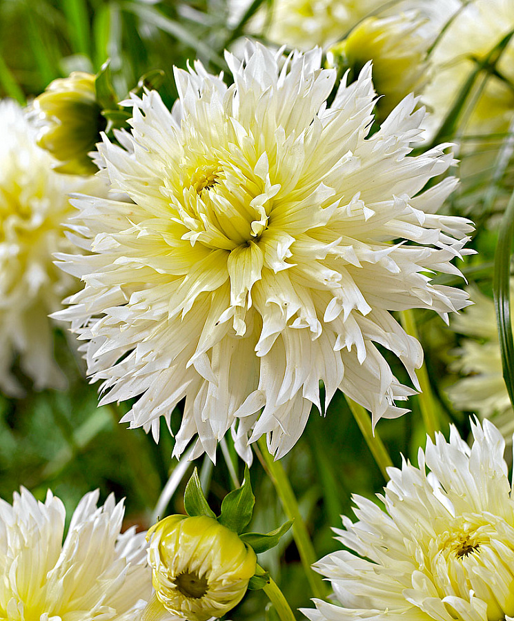 Георгина бахромчатая "Айс Кристал" - это волшебное растение, которое поразит вас своей красотой и изяществом. Ее стебель прочный и устойчивый, достигает высоты до 80 см, а цветки светло-лимонного оттенка с ярким желтым центром радуют глаз в течение нескольких месяцев весной и летом. Листья георгины имеют интересную форму, что делает это растение еще более привлекательным.