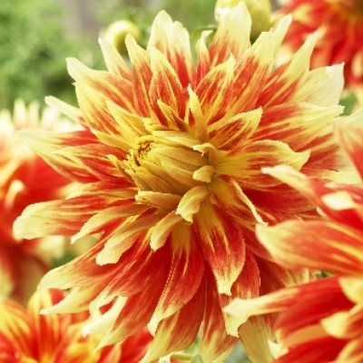 Луковицы Георгины махровой Бодакиоус (Bodacious, Dáhlia variabilis) чудесный выбор для декоративного оформления садов и цветников. Данный сорт вырастает до 100 сантиметров, на крепких стеблях формируются плотные шапки крупных цветков 23-25 сантиметров в диаметре, с оригинальным окрасом. Махровые лепестки ярко – красного оттенка меняются на нежно – желтый к внешней стороне. Георгина напоминает горящий факел, от нее невозможно отвести взгляд. Этот сорт отлично выглядит на клумбах, в цветниках, а также срезанные цветы в букетах, великолепно украсят интерьер помещений. Сорт предпочитает много света и солнца, безветрие, плодородные почвы.