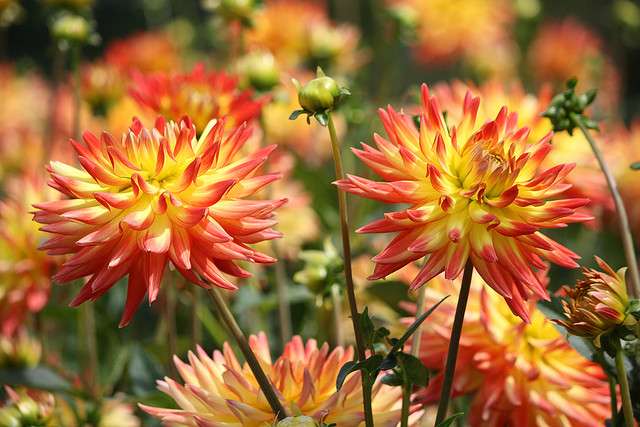 Луковицы георгины Bridgeview Aloha хорошо растут на рыхлых плодородных почвах. Место выбирают хорошо освещенное. При высадке между растениями придерживаются расстояния до 50-70 см. Кустарник вырастает до высоты 90-120 см и цветет все лето. Цветки очень красивые. Они махровые, состоят из многочисленных лепестков, кончики которых постепенно меняют свой цвет и в итоге становятся оранжево-красными. Соцветия крупного размера, диаметром до 15-20 см. Георгины Bridgeview Aloha хорошо смотрятся в саду, в одиночных или смешанных посадках, на клумбах и в бордюрах.