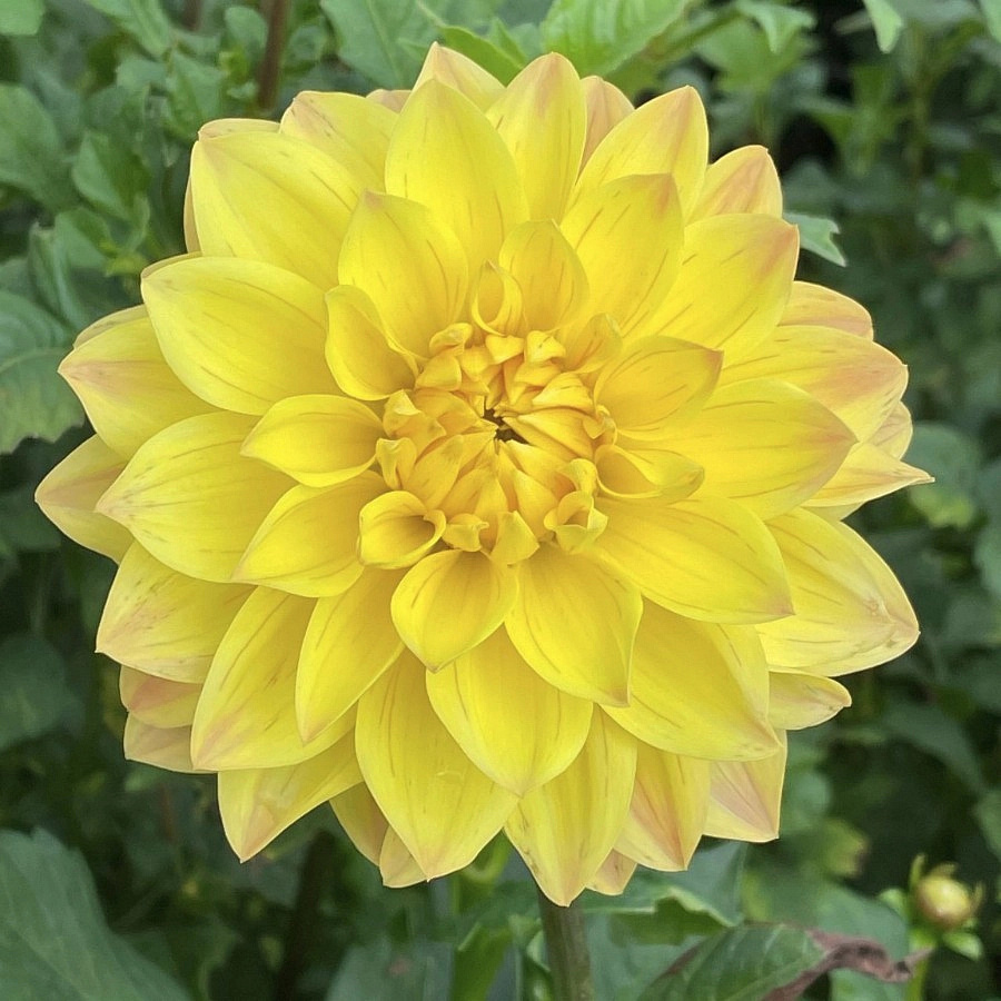Георгина декоративная американ сан - это великолепное растение с ярко-желтыми цветками, собранными в махровые соцветия. Ее зеленая листва создает прекрасный контраст и подчеркивает красоту цветков. Этот сорт георгины отличается высотой до 80-90 см и размером цветка 15-20 см, что делает его заметным акцентом в саду или на клумбе.