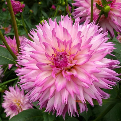 Георгина декоративная кордесса - это великолепное растение с изысканным цветком, который поражает своей красотой. Ее стебель прочный и устойчивый, достигая высоты до 100 см. Листья георгины имеют интересную форму и создают уникальный вид растения. Цветки этого сорта белые с нежной светло-лиловой каймой и лиловыми кончиками, размером до 14 см.