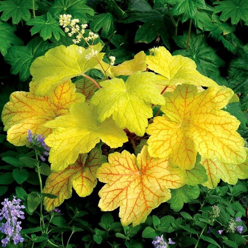 Рассада гейхеры Электрик Лайм (Electric Lime) идеально подходит для дополнения смешанных посадок, украшения искусственных водоемов и каменных горок. В начале сезона листья имеют нежную лаймовую окраску, а к осени на поверхности проступают красные прожилки, повышая декоративность растения. В середине лета появляются цветоносы с белыми соцветиями-метелками.