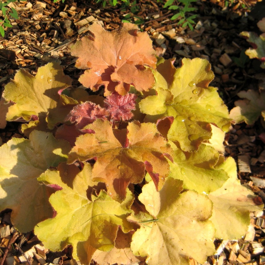 Гейхера гибридная биг топ голд - это удивительное растение с яркой и привлекательной листвой. Ее листья имеют оранжево-зеленую окраску сверху и розово-красную с нижней стороны, создавая неповторимый вид в любом саду. Этот сорт гейхеры отличается высотой до 35 см и диаметром до 35 см, что делает его идеальным выбором для групповых посадок или одиночных композиций.