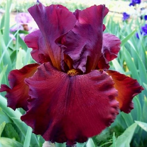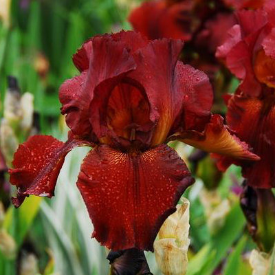 Ирис бородатый "Форт Апач" - это великолепное растение с насыщенно-каштаново-красными цветками, которые привлекают внимание своей красотой и изысканностью. Этот сорт ириса отличается высокими показателями, достигая в высоту до 90 см. Листья имеют интересную форму, что делает растение еще более привлекательным.