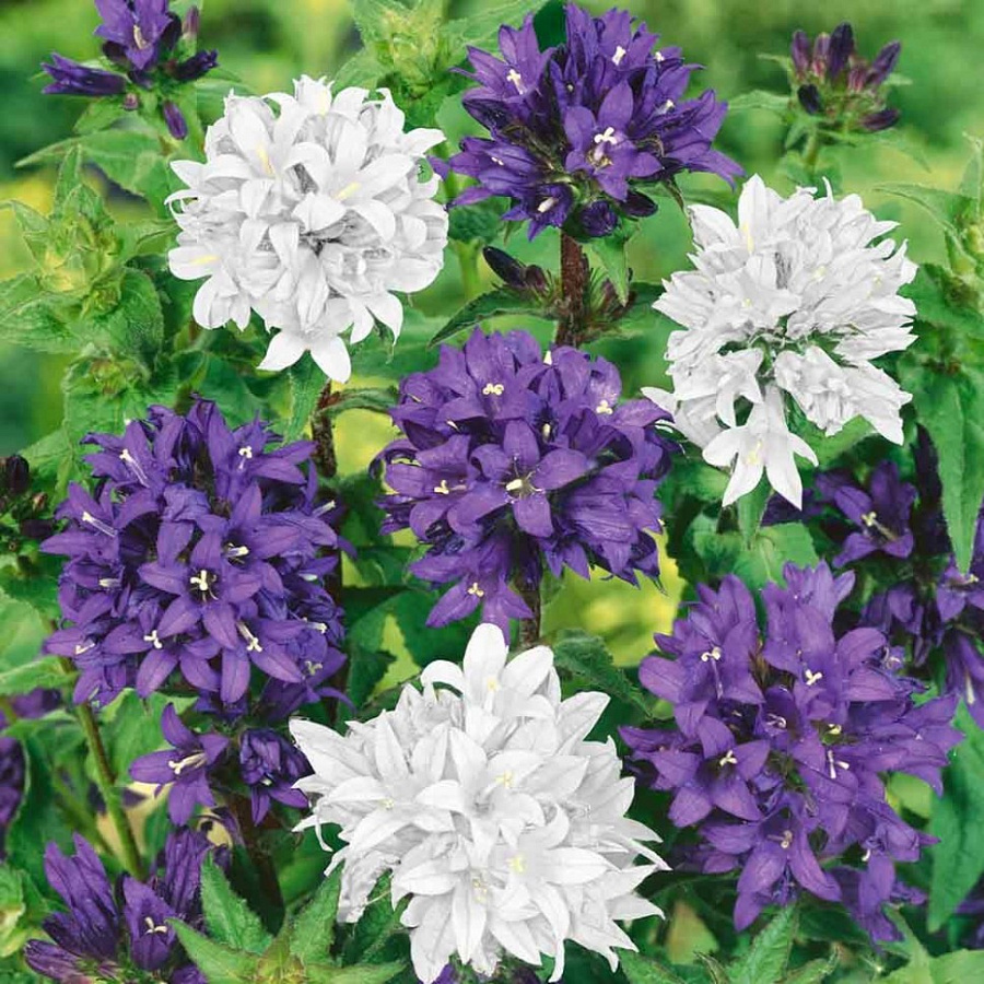 Семена колокольчика скученного Смесь – удобный микс для создания эффектного цветника, оформления рабаток или наполнения декоративных ящиков. В состав набора входят сорта с белоснежными и фиолетовыми цветами. Нарядные букетики будут радовать глаз с начала до середины лета, и наполнять воздух потрясающим запахом.
