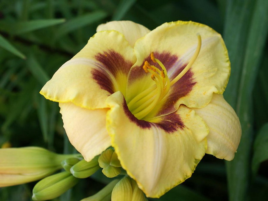Окраска цветка : Кремово-желтая с темно-бордовым центром и зеленым горлом