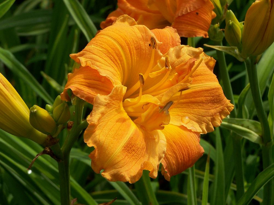 Саженцы Лилейника Гибридного Оранж (Orange Hemerocallis) подходят и для оформления цветников, и высадки вдоль заборов и изгородей. Это очень неприхотливое растение, которому требуется лишь плодородная почва при посадке и регулярный полив при засушливом лете. Куст быстро разрастается, каждый год увеличивая количество крупных оранжевых бутонов. Цветы в диаметре достигают 12 сантиметров, лепестки сильно вывернуты наружу. Бутоны радуют яркими красками с середины лета до конца августа. Куст в высоту достигает полуметра, в редких случаях может вырастать до 70-80 сантиметров.
