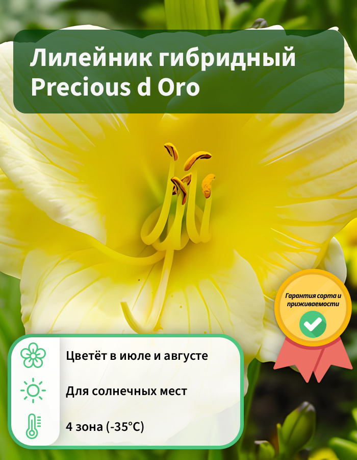 Лилейник гибридный Precious d'Oro - травянистое многолетние растение не требует укрытия, хорошо зимуют. Precious d'Oro относится к спящему, повторно цветущему диплоиду со средним сроком цветения, обильно цветущий. Диаметр кремово-желтых с зеленым горлом цветков достигает 10 см. Лепестки цветка гофрированные. Куст компактный в высоту достигает 50 см. Рекомендуем высаживать растение на хорошо освещенных местах.