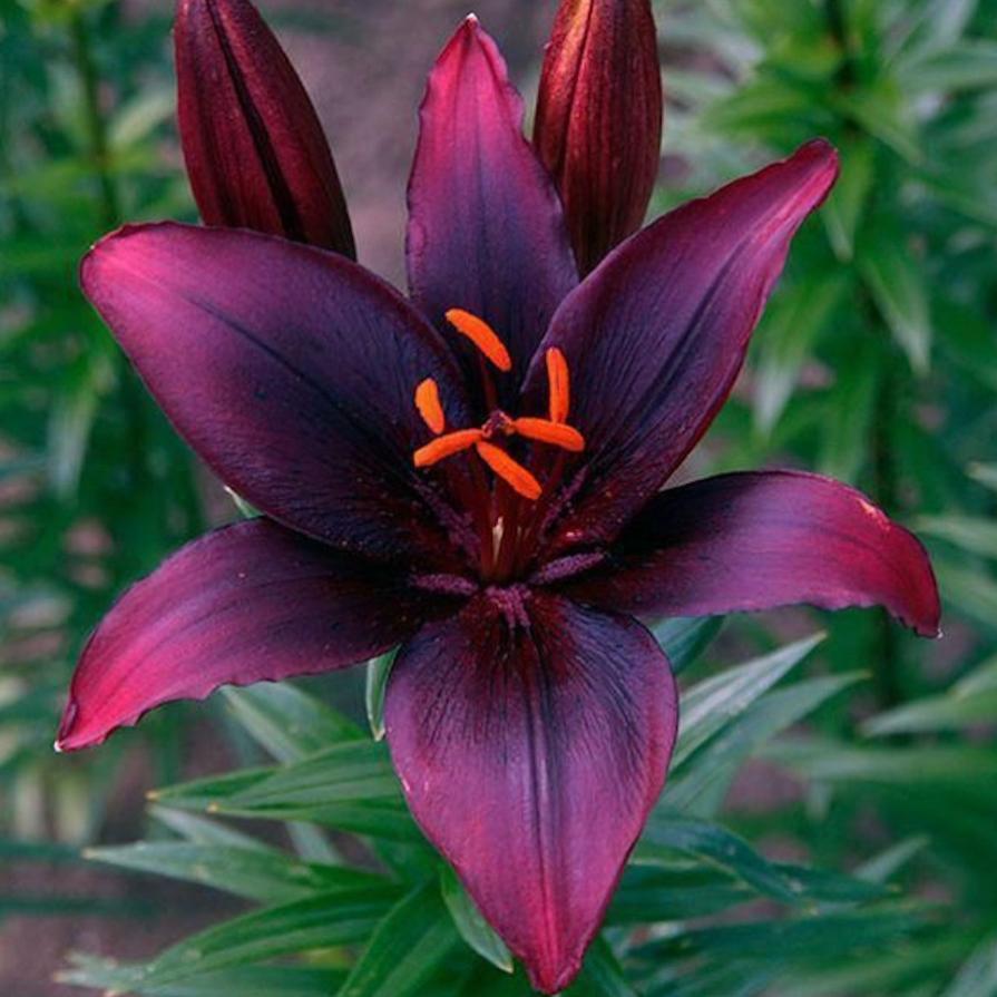 Крупные цветы темно-бордового, почти черного к середине оттенка имеют глянцевый блеск и ярко-оранжевые пыльники. На высоком (до 100 см) стебле одновременно распускается от 5 до 7 цветков. Куин ов Найт полюбилась цветоводам за свой длительный ― с июня по сентябрь – срок цветения и легкость размножения.