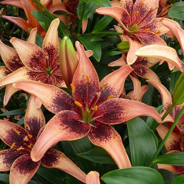 Луковицы Лилии азиатской Танго Уислер (Lilium asiatic Tango Whistler) ― гибридный сорт с достаточно редкой окраской. Крупные цветы лососево-желтого цвета украшены темным крапом и плотным бордовым напылением у основания лепестков. На темном фоне выделяются контрастные крупные желтые тычинки.