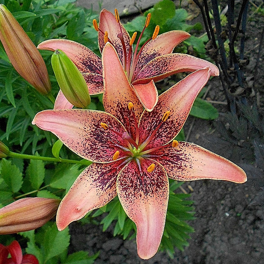 Окраска цветка : лососевые лепестки, бордовое плотное напыление, жёлтые тычинки