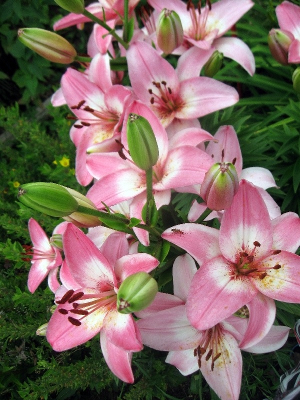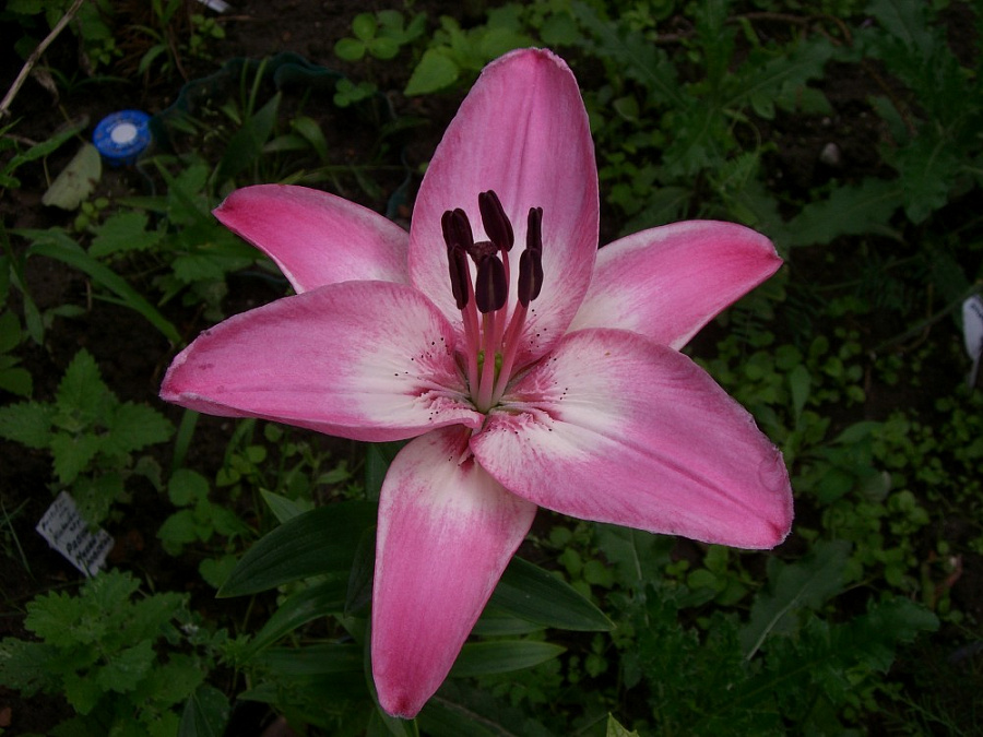 Окраска цветка : Цветки плотной фактуры, розовые, кончики лепестков более насыщенные, центр белый с темно-розовым крапом; в горле ярко-розовые; направлены вверх
