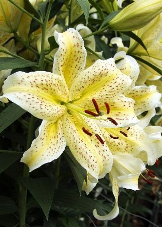 Окраска цветка : тигровая, цветок КРУПНЫЙ, кремово-желтый, красно-оранжевый крап и пыльники