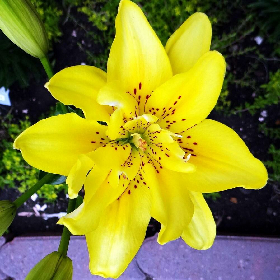 • Окраска цветка : Цветки чашевидные, махровые (12 лепестков), ярко-желтые, ближе к центру единичный мелкий крап