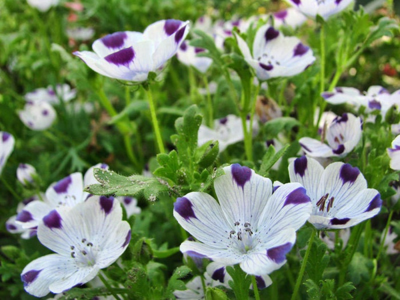 Семена немофилы пятнистой (Nemophila maculata) Божья коровка высевают в открытый грунт в апреле, и уже в июне любуются красивоцветущей полянкой. Однолетнее почвопокровное растение низкое, высотой до 20 сантиметров. Стебли разветвленные, полустелющиеся. Листья перистолопастные, опушенные. Нежные цветки немофилы пятнистой похожи на крупные лютики. На конце каждого белого лепестка имеется по одному синему или лиловому пятнышку, отсюда и оригинальное название сорта — «Божья коровка». Любит полутень и влажную почву. Особенно эффектна в бордюрах, в подвесных контейнерах и вблизи водоемов.