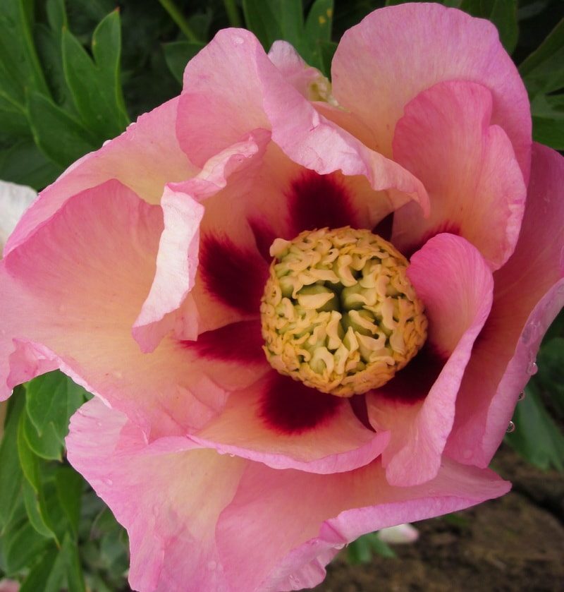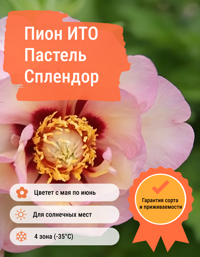 Семена и рассада пиона ИТО - гибрида «Пастель Сплендор» вырастают до высоты в 70 см, без учета бутонов. На стеблях большое количество продолговатой светло-зеленой листвы. Растение относится к среднепозднему сроку цветения, распуская на кончиках побегов пышные десятилепестковые бутоны с двухцветными лепестками. Доминирующими оттенками выступают бежевый, розовый и бордовый, по центру желтая сердцевина. Нужно правильно рассчитать уровень посадки, ведь они не будут цвести при превышении или недостатке от нужного уровня. Высаживают на солнечном месте.