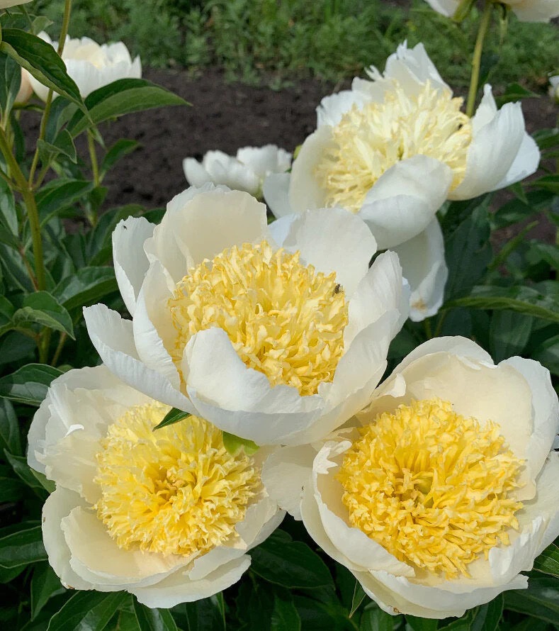 Саженцы пиона Gold Standard (Голд Стандарт) Цветок японской формы имеет несколько слоев кремово-белых лепестков, расположенных на верхушках красных пестрых стеблей чашеобразной формы, с мягким нежно жёлтым центр и белыми кончиками дополняют цветовую гамму. Это эффектный, высокий сорт с прямыми, тяжелыми стеблями. С легким изысканным ароматом