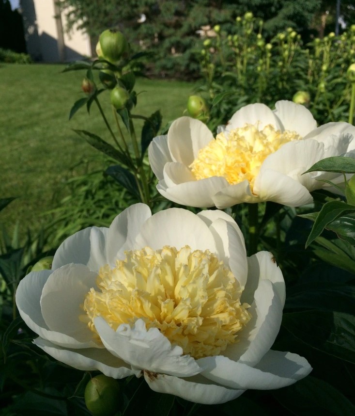 - Пионы используются для посадки многолетних клумб или создания групп растений. Они хорошо сочетаются с лилейниками, астрами или другими луковичными растениями.