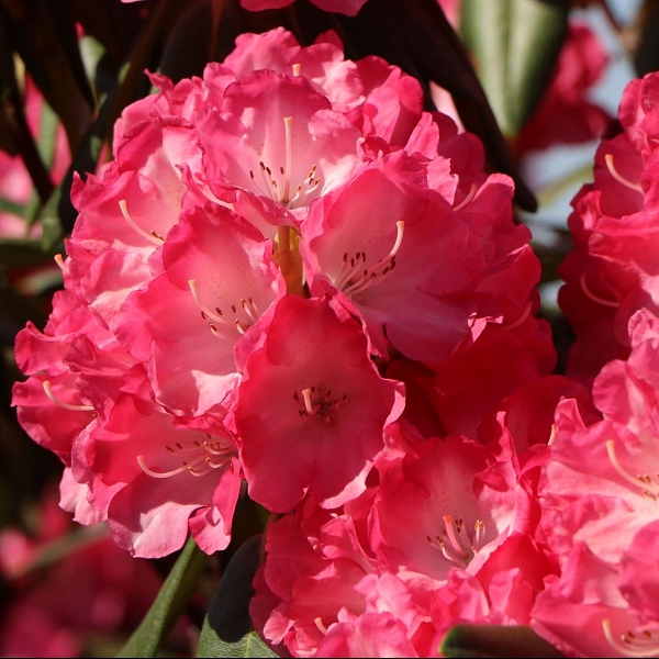 Саженцы рододендрона Фантастика (Fantastica) вырастают в эффектные кустарники, цветение которых украсит любые виды газонов и клумб. Растение имеет яркие темно – розового цвета снаружи и светлее внутри цветочки в конической формы соцветиях, которые радуют долгим пышным цветением в мае – июне. У растения кожистые вечнозеленые крупные листья. В рост саженец рододендрона Фантастика идет медленно. Требования к выращивания растения: влажные, с хорошим дренажом почвы; чуть затененные участки для высадки; не требуется укрывание в зиму, куст выдерживает до -25 градусов. Крупномер растения может высаживаться как одиночно, так и группами.