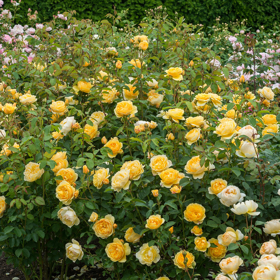 Рассада розы кустовой Грэхэм Томас (Graham Thomas): сорт притягивает взгляды яркими желто-оранжевыми цветами и манит сладким душистым ароматом. Сорт получил имя в честь известного садовода. Куст имеет прямую форму с сильно ветвистыми побегами. Махровые цветы розеточного типа демонстрируют изумительный желто-оранжевый оттенок. Побеги могут слегка поникать под тяжестью цветов, поэтому куст можно вырастить, как плетистый. Высота взрослого растения 120 см. После цветения образуются плоды с семенами. Особенности розы Грэхэм Томас: идеальные места для посадки - открытые солнечные участки, на которых сорт дает максимально обильное цветение; корни не выносят грунтовые воды; растение предпочитает рыхлый и окультуренный грунт.