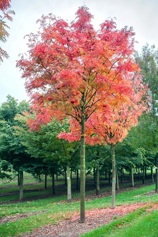 Саженцы рябины плодовой Додонг (Sorbus Dodong) особо красивы осенью – листва окрашивается в целую палитру оттенков – от оранжево-желтого до красно-багрового. Дерево раскидистое, с ажурной кроной, достигает до 8 метров в высоту. Листья длинные – около 20 сантиметров в длину, непарноперистые. Состоят из множества узких ланцетовидных листочков, которые придают дереву экзотический вид. Цветет данный сорт рябины в конце мая. Ягоды крупные, красно-оранжевого оттенка, грушевидной формы. Растение предпочитает солнечные участки. Молодые деревья требуют формировки кроны путем обрезки. Прочные ветки хорошо сопротивляются обрезке. Зимостойкость – повышенная.