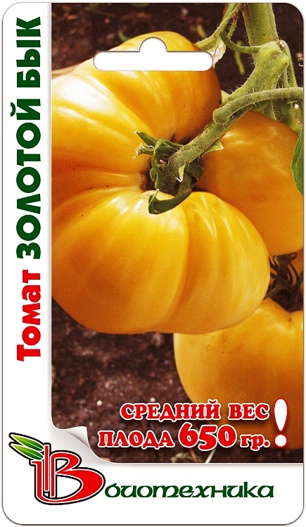 Семена томата "Золотой бык" (Zolotoj byk) превращаются в среднерослое растение. На каждой кисти завязывается по 4-5 плодов. Помидорки плоскоокруглой формы, слабо-ребристые, гладкие, с блестящей кожицей. Средняя масса достигает 400-450 грамм. Мякоть сахаристая, мелкосемянная. Плоды отличаются оригинальной ярко-золотой окраской и розовой сердцевиной. Используют урожай исключительно для свежего потребления. Сорт обладает высокими вкусовыми характеристиками и товарными качествами. Для получения богатого урожая культуру следует формировать и своевременно удалять старые листья.