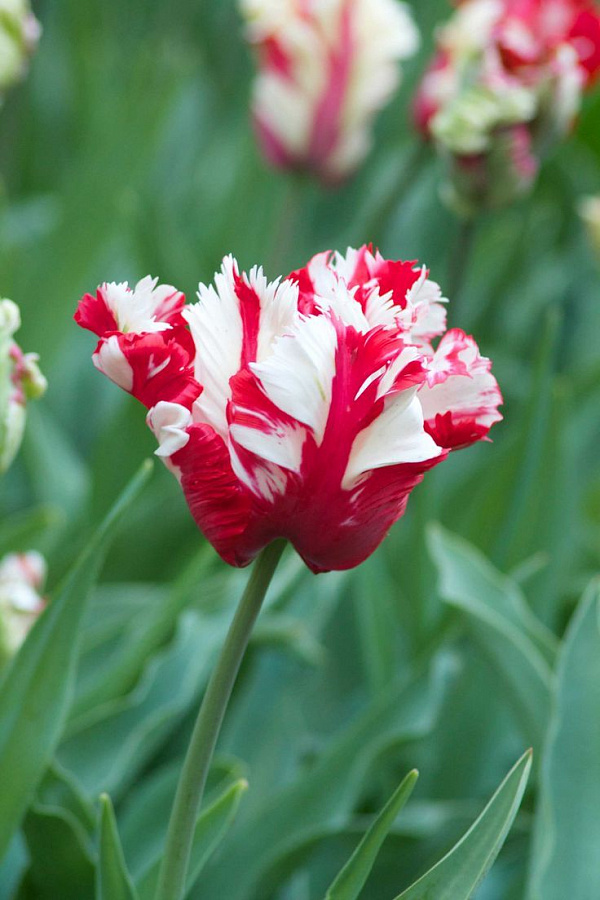 Луковицы тюльпана Эстелла Ринджвелд (Estella Rijnveld) дают отличное оригинальное растение из самого необычного вида тюльпанов – попугайных. Они имеют крупный пестрый бокал красно-белого цвета, напоминающий экзотического попугая. Это растение цветет в течение двух трех недель с середины мая. Ему нужны для посадок нейтральные почвы, если почва кислая, ее известкуют заранее. Кроме того правильными условиями в агротехнике являются: