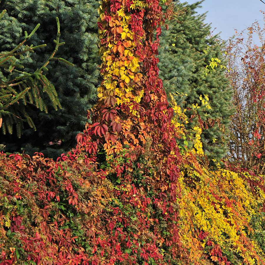 Саженцы Винограда девичьего пятилисточкового Еллоу Уолл (Yellow Wall) осенью «озолотят» ваше подворье ярко-жёлтым окрасом листьев. Устойчив к зиме, а в жаркую погоду любит умеренный полив. Растёт быстро, достигая 14м в длину. Чередуя Yellow Wall с другими сортами, к осени можно получить потрясающую палитру красок. Как любая лиана, требует хорошей опоры (пергола, беседка, стена) для стремительного роста побегов. Цветёт в конце мая малозаметными белыми цветками. Тёмно-синие плоды можно получить уже в сентябре первого года, если высадить сразу крупномер Yellow Wall.