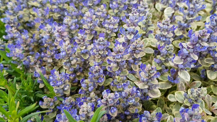 Саженцы Живучки ползучей Принцесса Надя (Princess Nadia Ajuga reptans) помогут красиво оформить проблемные участки сада, влажные почвы, расположенные в тени деревьев или в непосредственной близости от водоемов. Это растение отлично себя чувствует в таких условиях, быстро заполняет свободное пространство, формируя оригинальный ковер из пестрых зелено-желтых листьев. С мая начинается цветение куста, побеги поднимаются вверх, достигая 15-20 сантиметров. Сине-фиолетовые мелкие соцветия равномерно распределяются по всему побегу. В июле следует полностью очистить куст от завядших бутонов для поддержания декоративности почвопокровного растения.